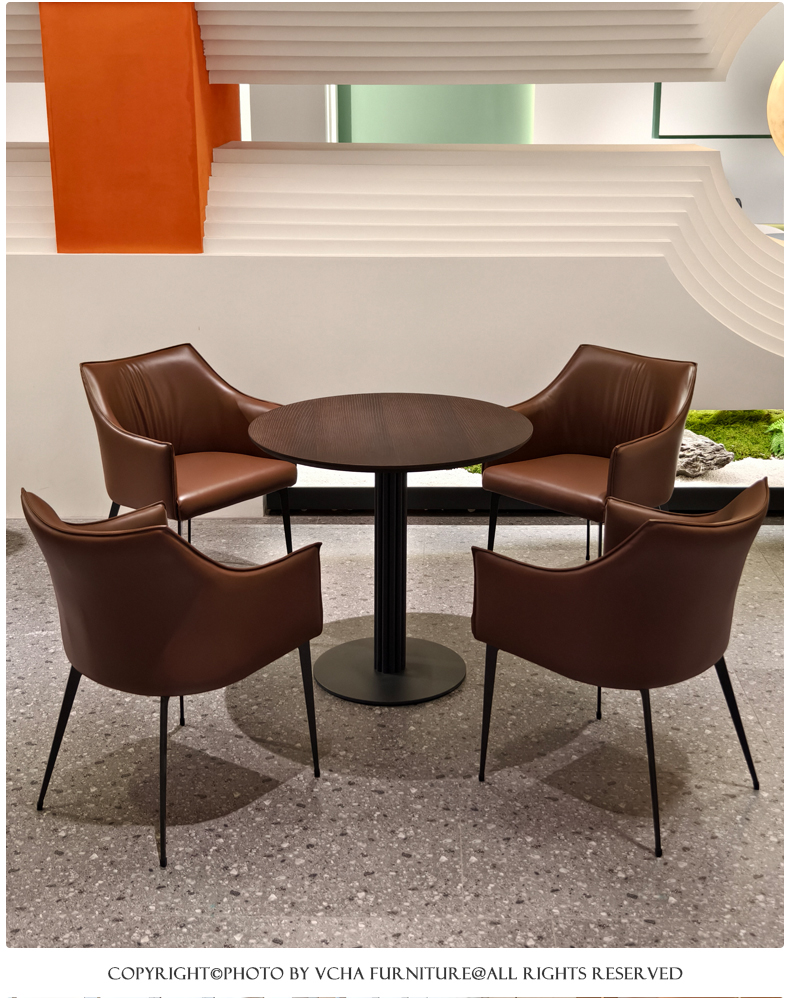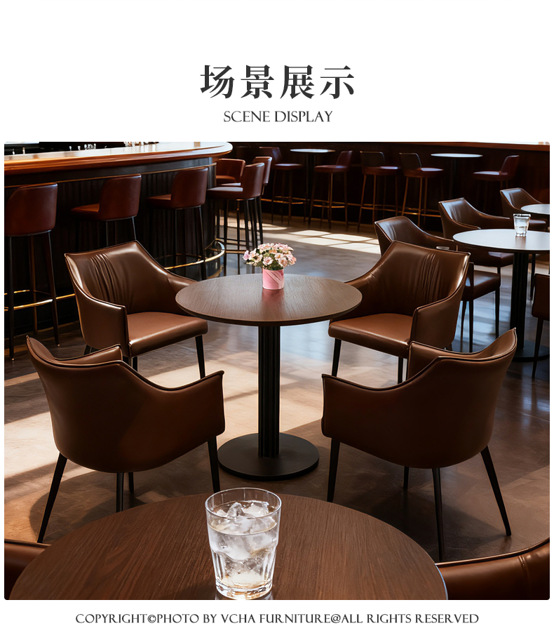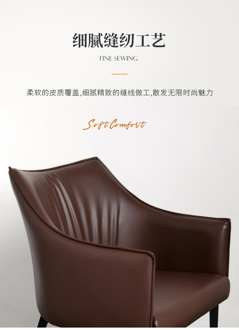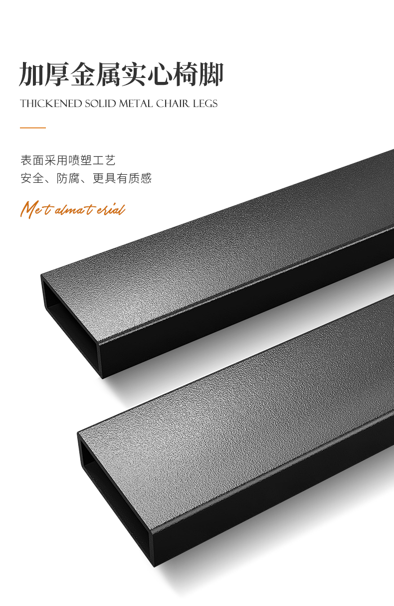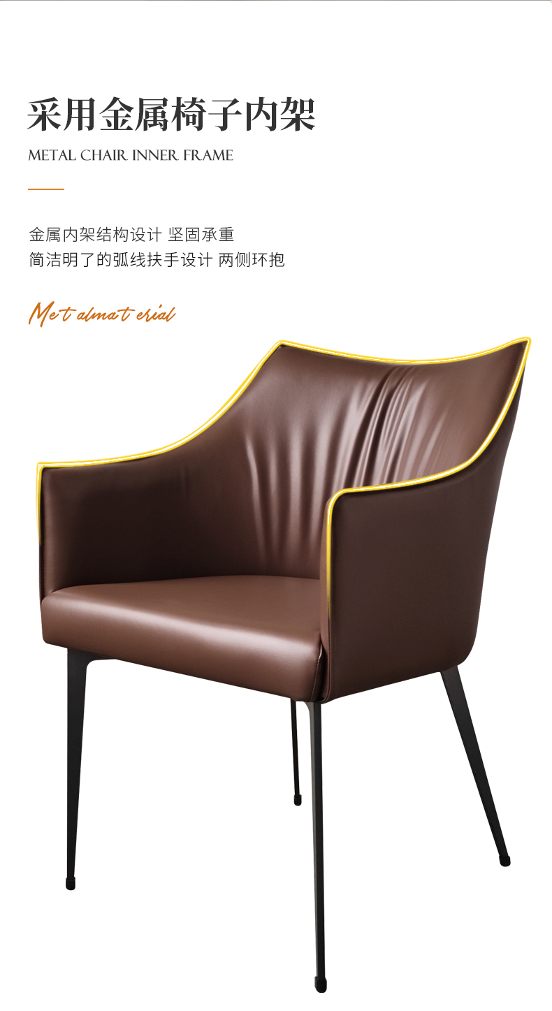 靠背:五金铁架椅子内架,内部填充高密度回弹海绵,皮革采用专色专定优质西皮面料,加厚材质,手感舒适脚架:加厚五金实心铁脚,结实稳固优雅