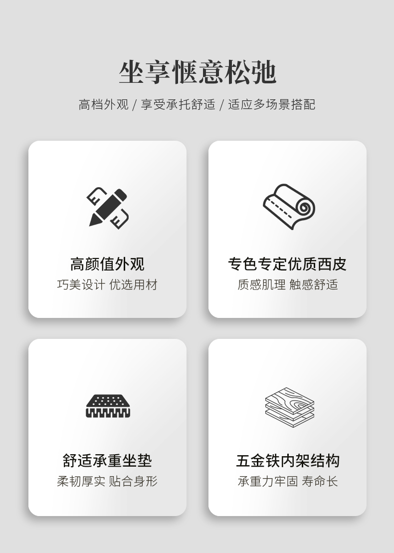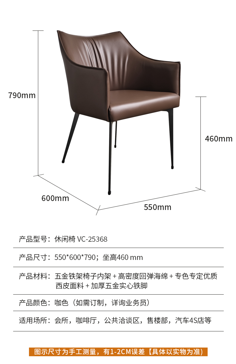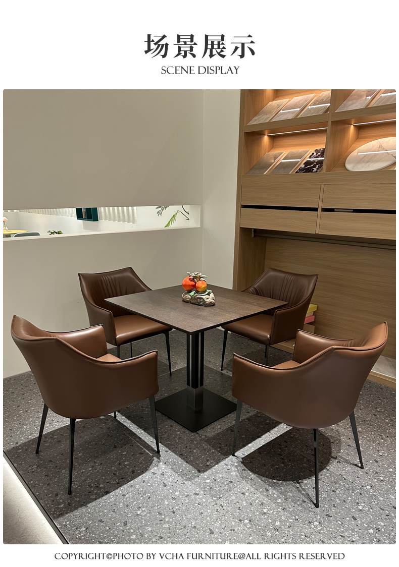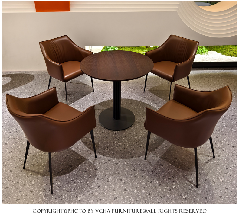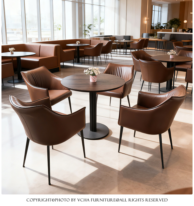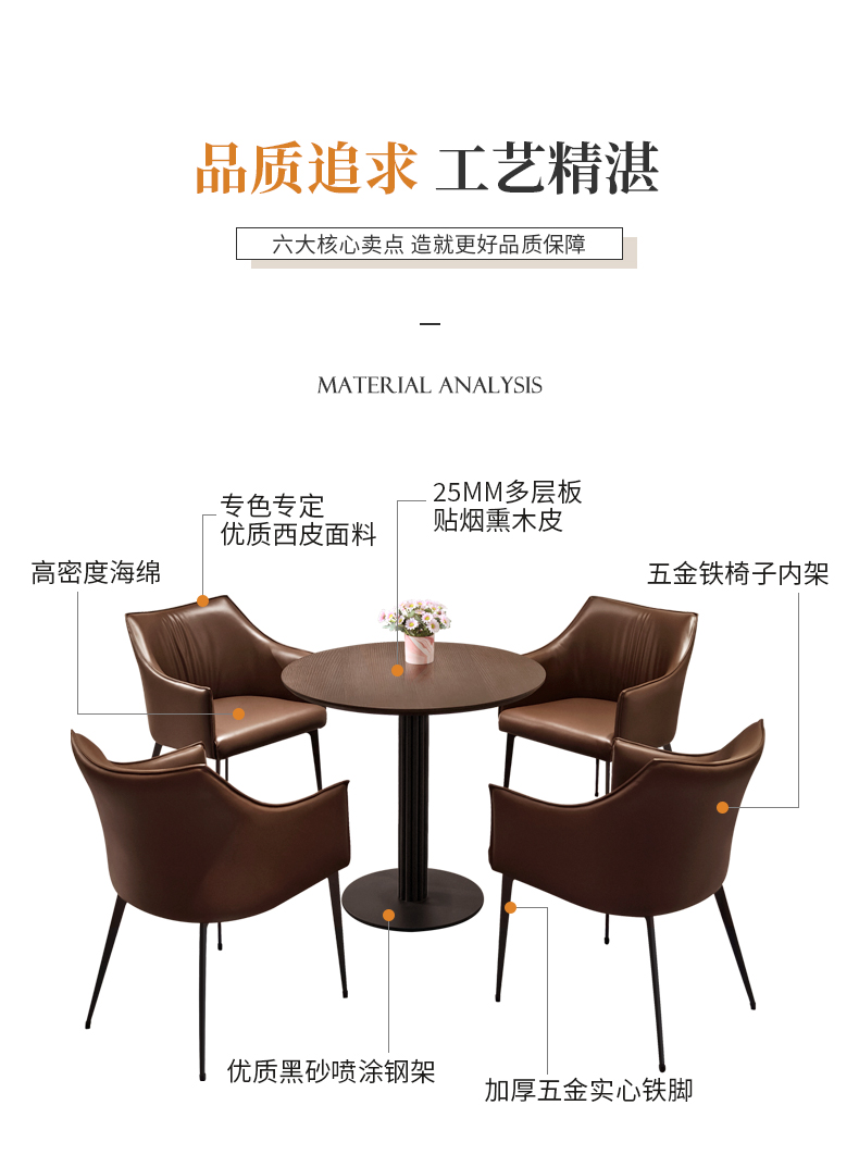 靠背:五金铁架椅子内架,内部填充高密度回弹海绵,皮革采用专色专定优质西皮面料,加厚材质,手感舒适脚架:加厚五金实心铁脚,结实稳固优雅