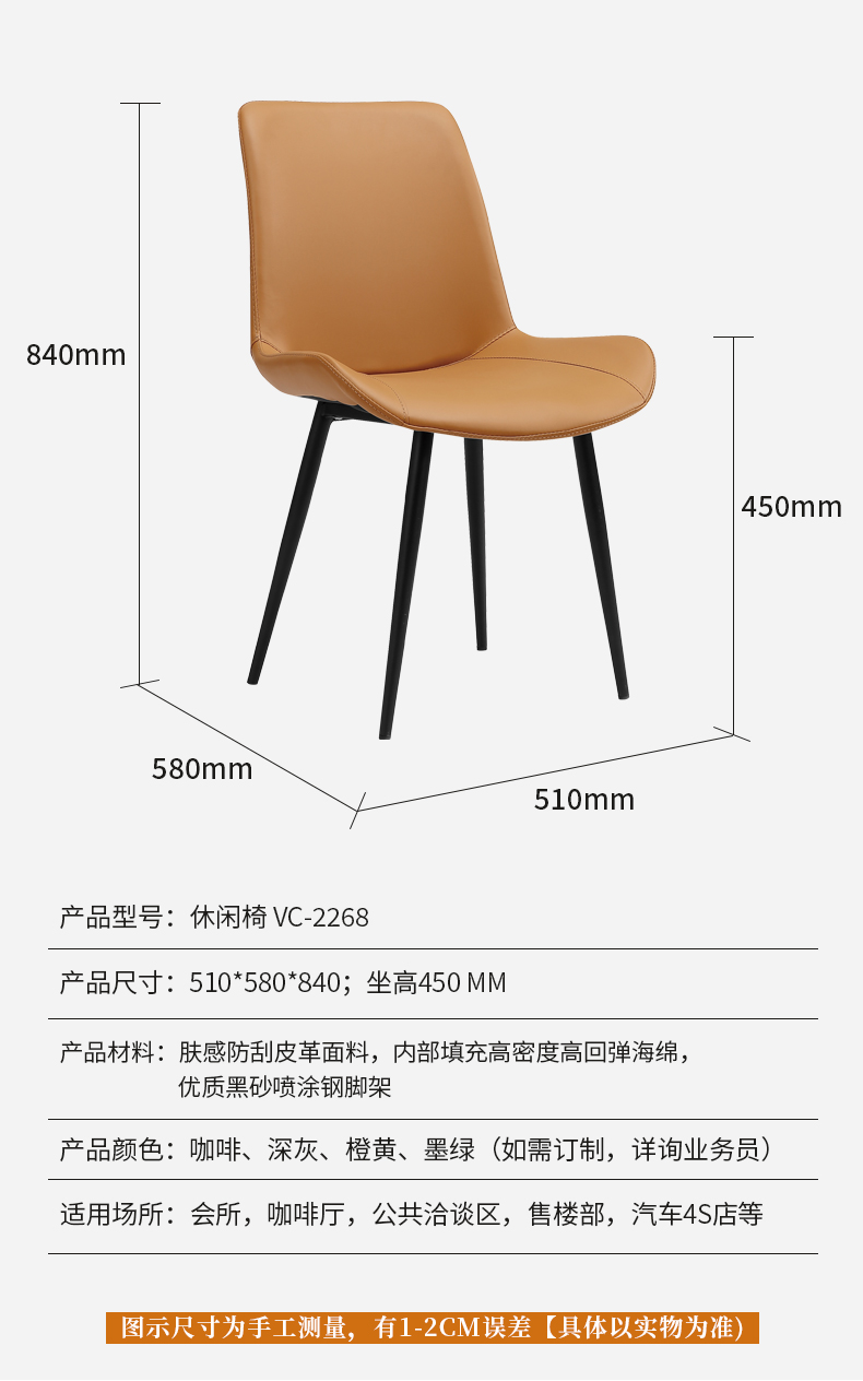 尺寸:510*580*840MM;坐高450MM靠背:肤感防刮皮革面料,内部填充高密度高回弹海绵脚架:优质黑砂喷涂钢架,简约大气
