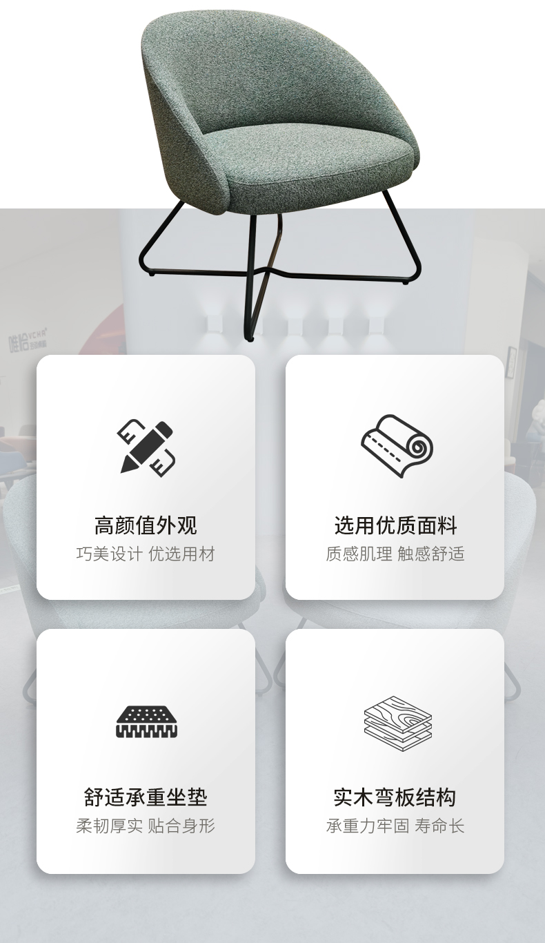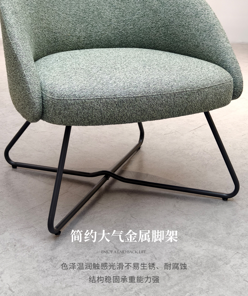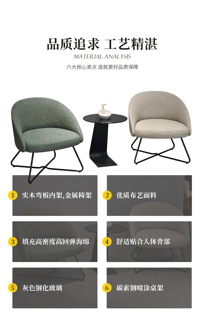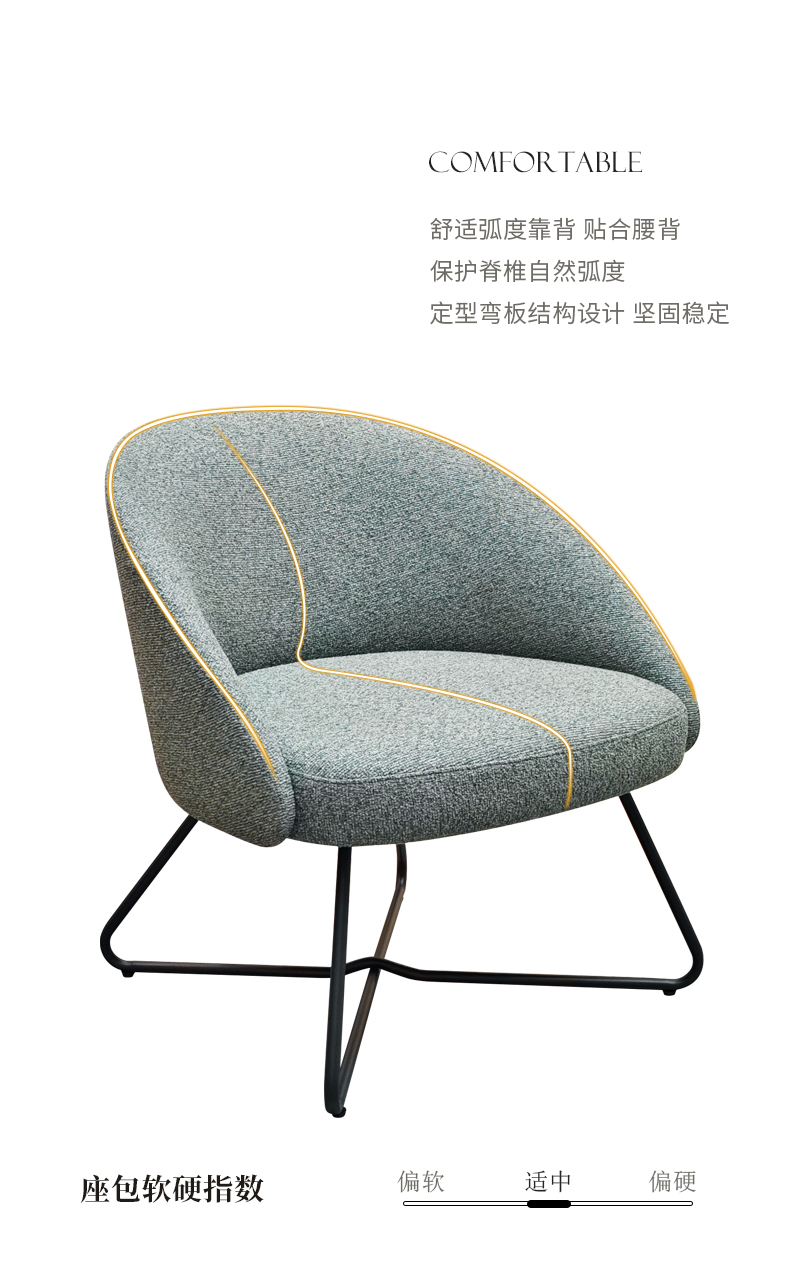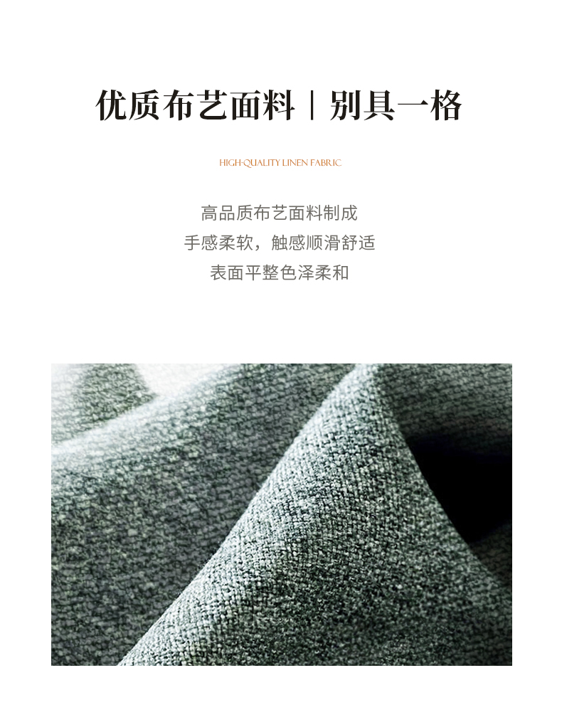 沙发:实木弯板内架,贴合人体,填充高密度海绵,舒适回弹,表面使用优质布艺面料,触感亲肤 脚架:五金脚架,稳固简约大气