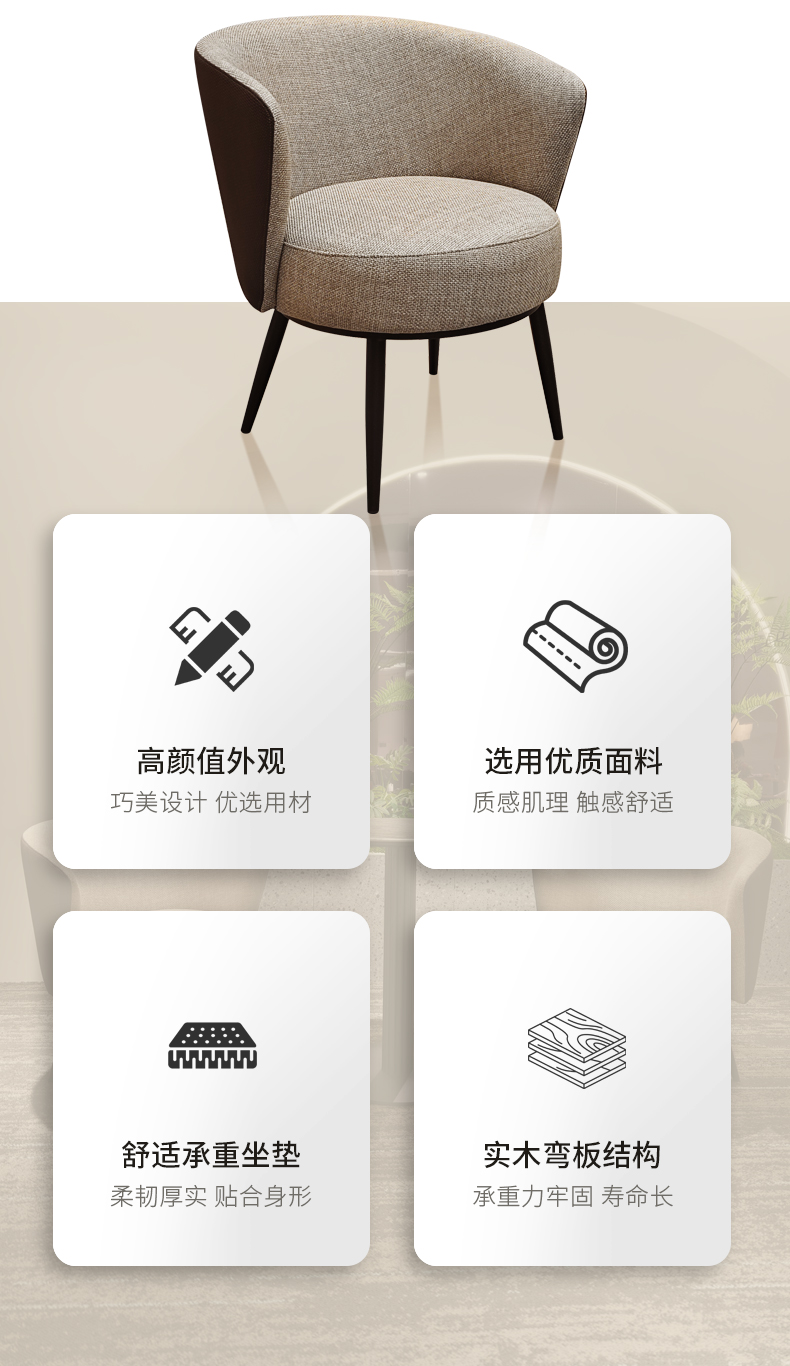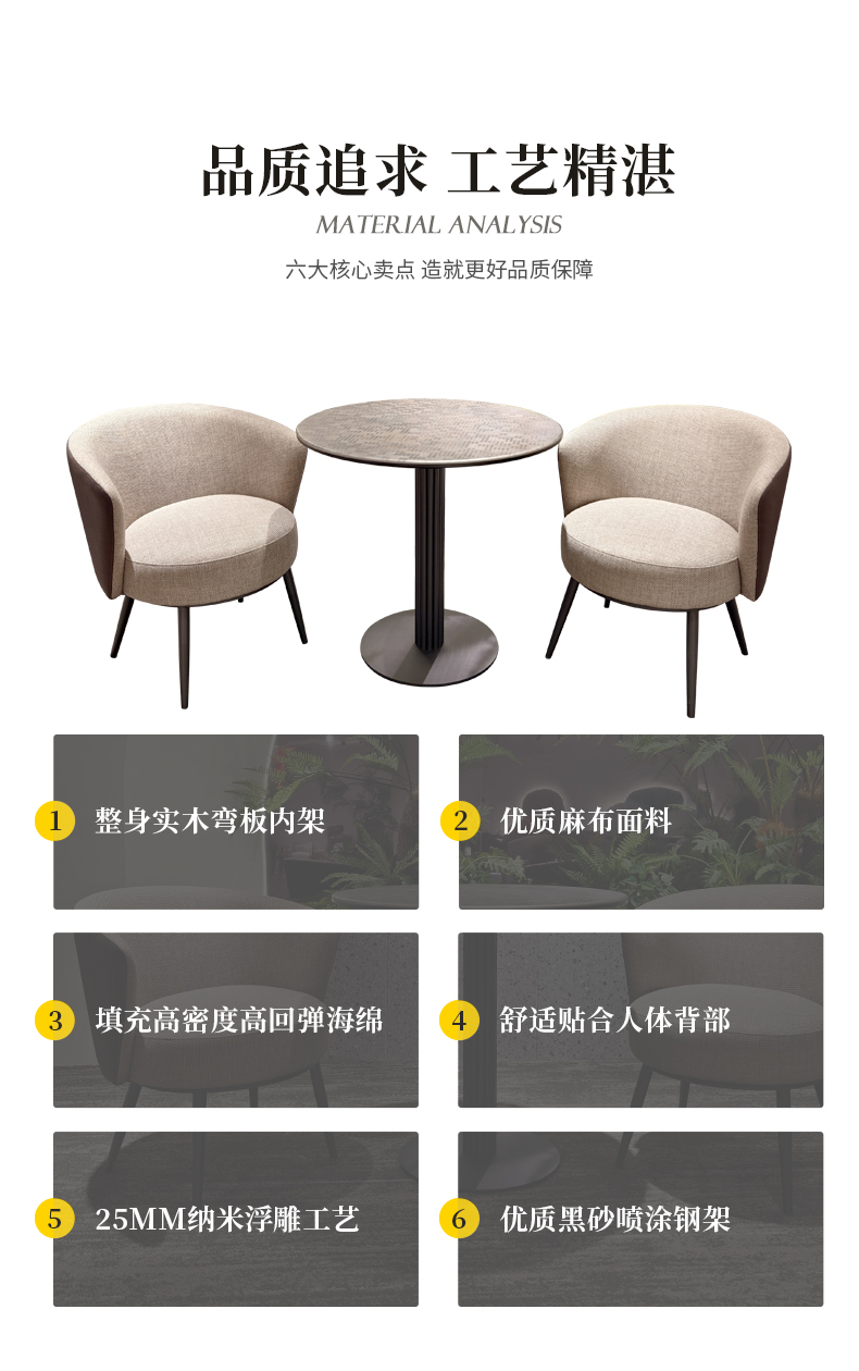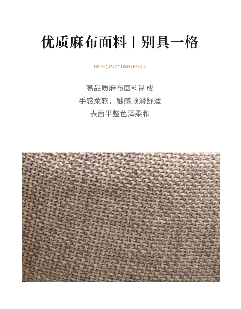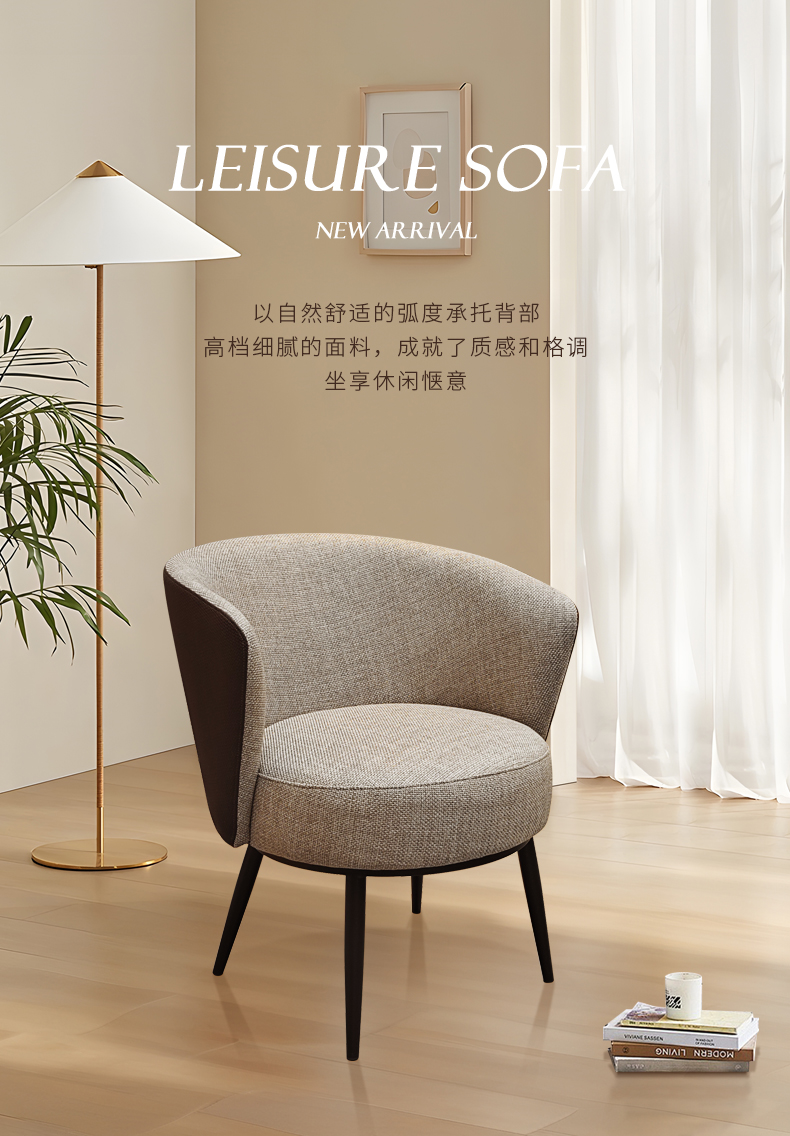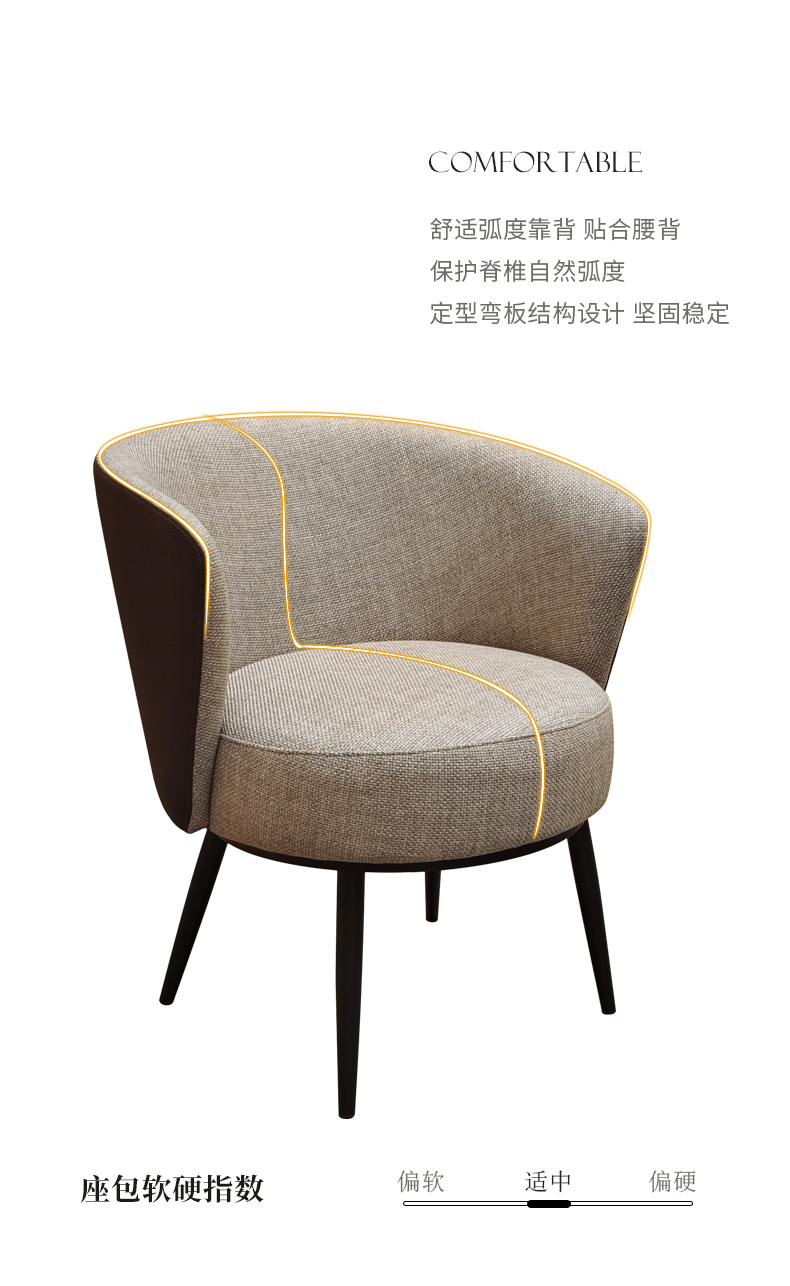 沙发:实木弯板内架,贴合人体,填充高密度海绵,舒适回弹,使用优质布艺面料搭配布纹皮革 脚架:五金脚架,稳固简约大气