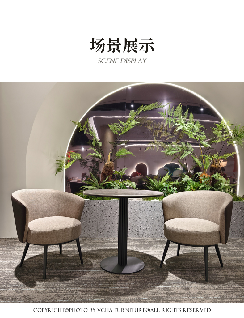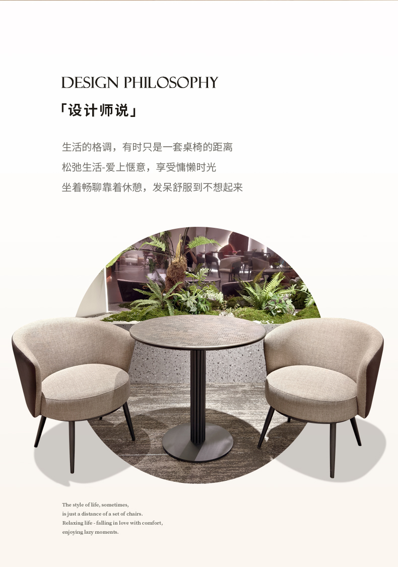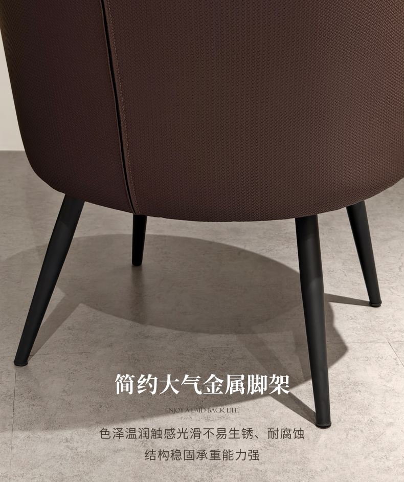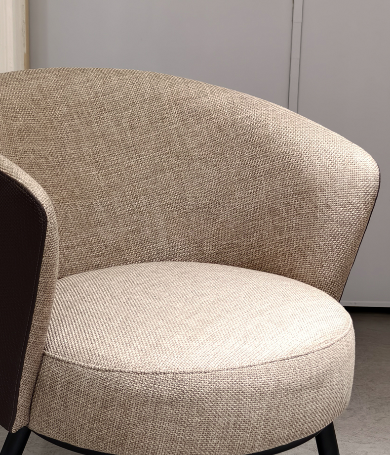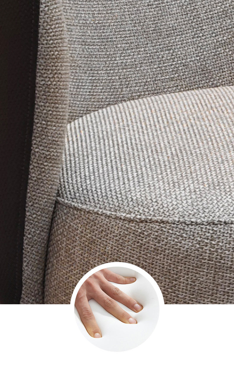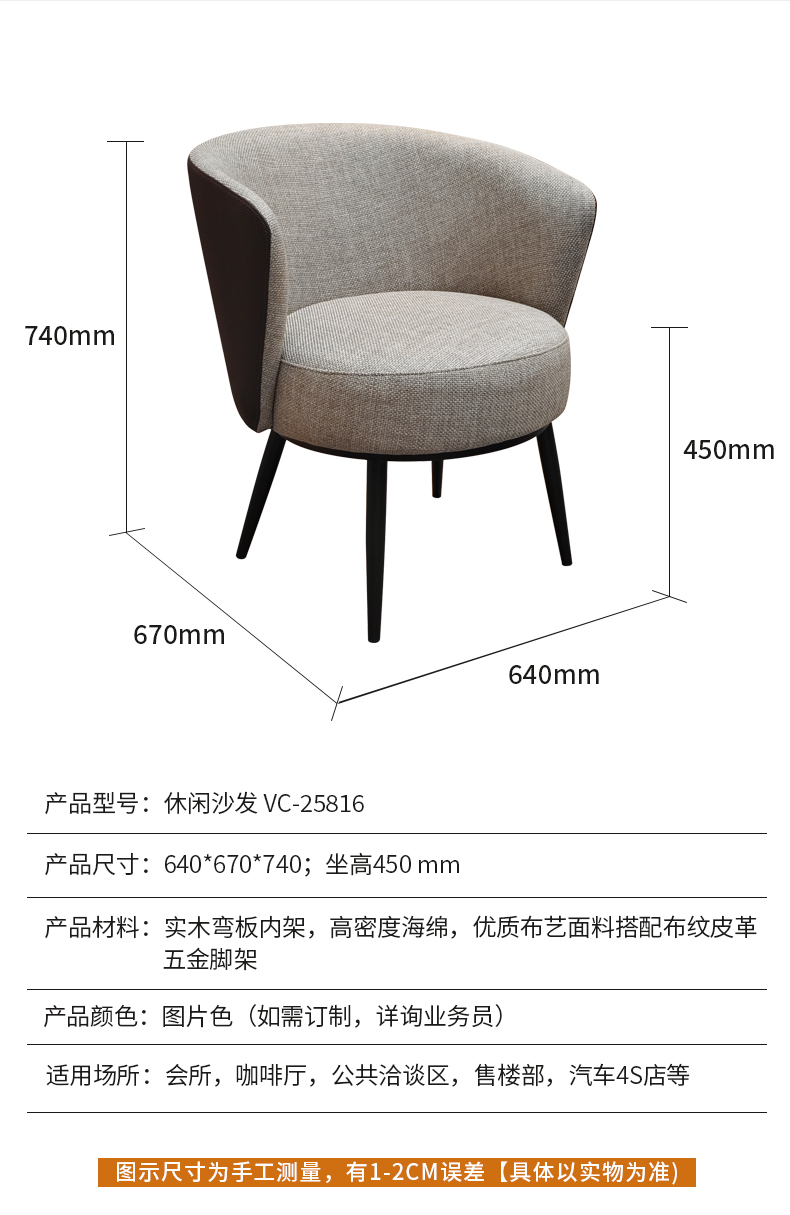 沙发:实木弯板内架,贴合人体,填充高密度海绵,舒适回弹,使用优质布艺面料搭配布纹皮革 脚架:五金脚架,稳固简约大气